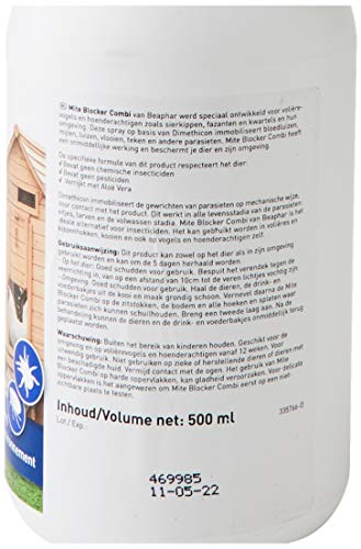Goed schudden voor gebruik. – Op het dier: Bespuit het verendek tegen de veerrichting in, van op een afstand van 10cm tot de veren lichtjes vochtig zijn. – Omgeving: Haal de dieren, de drink- en voederbakjes uit de kooi en maak grondig schoon. Vernevel daarna de Mite Blocker Combi op de zitstokken, de bodem en alle hoeken en spleten waar parasieten zich kunnen schuilhouden. Breng een tweede laag aan. Na de behandeling kunnen de dieren en de drink- en voederbakjes onmiddellijk terug geplaatst worden. De behandeling kan om de 5 dagen herhaald worden.