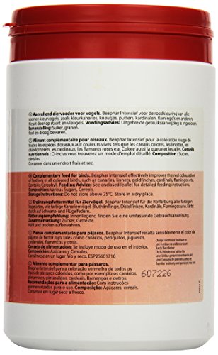 Intensief rood is een voedingssupplement voor roodkleuring vogels zoals kleurkanaries, kneutjes, putters, kardinalen, flamingo’s en anderen. Kleurt door op staart en vleugels.