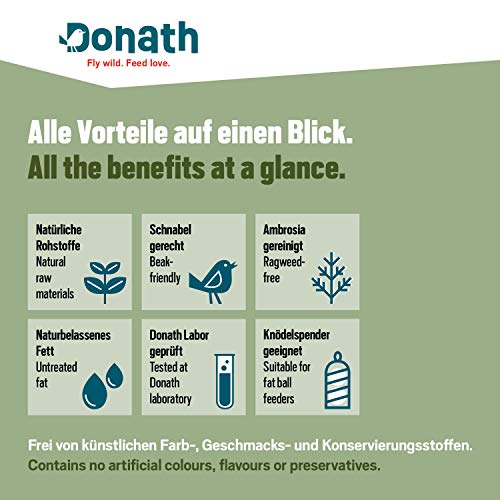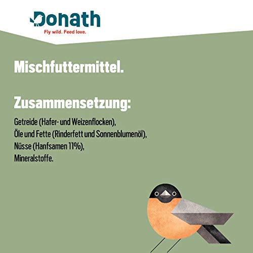 Donath Hennep Energie Ballen zonder Net zijn vooral populair bij alle meesoorten, mussen, boomklevers, vinken, spreeuwen en ook spechten. Deze waardevolle energieknoedel bevat alles goed met een extra portie hennepzaden voor gezonde wilde vogels. Het is gemaakt met waardevolle hennepzaden (11 procent) met veel gezonde onverzadigde vetzuren, gezonde hartige haver- en tarwevlokken, het beste rundervet, geselecteerde mineralen van hoge kwaliteit met zonnebloemolie. Ideaal om het hele jaar door te voeren. Komt in 5 kg.