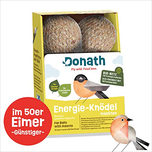 Donath Insecten Energie Ballen in Biologische Net zijn vooral populair bij alle meesoorten, mussen, boomklevers, vinken, spreeuwen en ook spechten. Deze energieballen zijn gemaakt met insectenvet gemaakt van ongeveer 3000 insecten per kg dumplings, gezonde hartige haver- en tarwevlokken, vitaminerijke, olierijke, gepelde zonnebloempitten, het beste rundervet. Ideaal om het hele jaar door te voeren. Komt in 600 g.