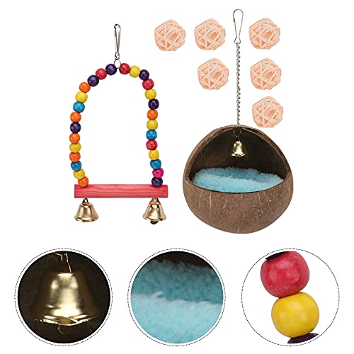 De set bevat rotan balspeelgoed, schommel speelgoed en kokosnoot schelpnest, wat een comfortabel leven voor je papegaai creëert.
