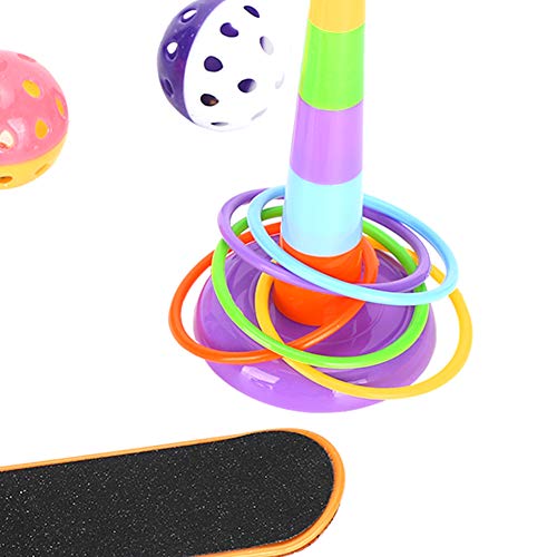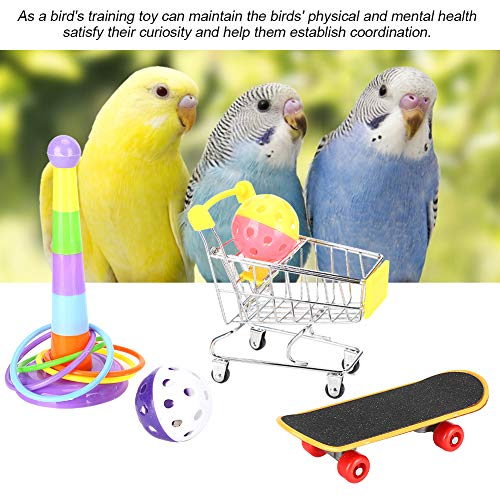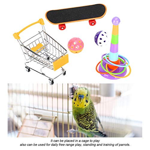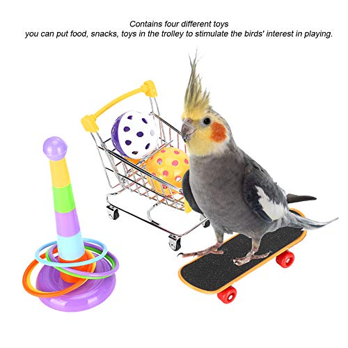 Deze set bevat 4 soorten verschillend speelgoed voor papegaaien: mini-winkelwagentje, skateboard, ballenbellen en speelgoed met trainingsringen.
