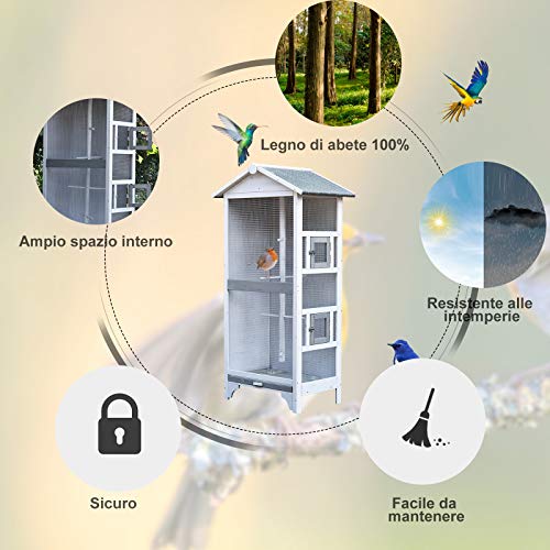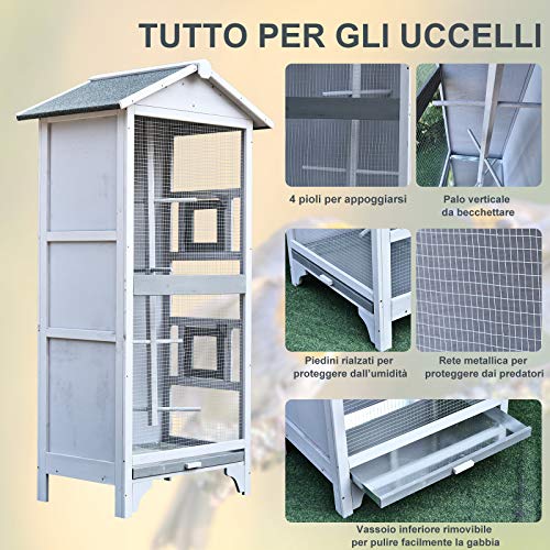 Pawhut Vogelkooi voor buiten van dennenhout, 2 openingen met blok 4 zitstangen en afneembaar dienblad, grijs, 80,5 x 57…